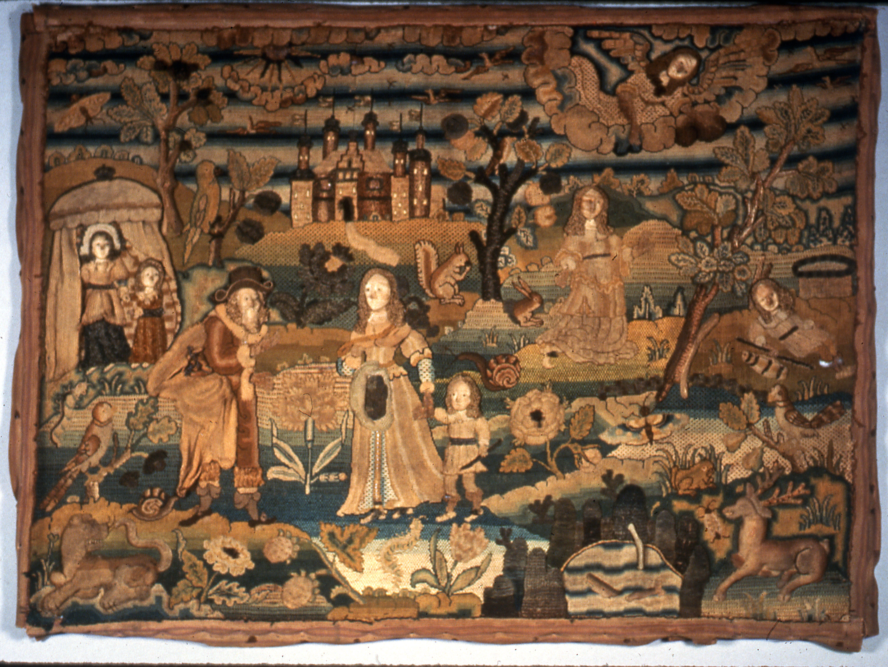 This is a Embroidered picture. It is dated 17th century and we acquired it in 1981. Its medium is silk and metal-wrapped silk embroidery on linen foundation with pearls, metal, mica, cotton tapes and its technique is embroidered in rococo, satin, tent, half-cross, romanian, wrapping, and looping (needle lace) stitches with applique on plain weave foundation. It is a part of the Textiles department.