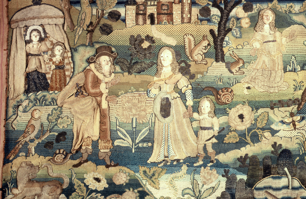 This is a Embroidered picture. It is dated 17th century and we acquired it in 1981. Its medium is silk and metal-wrapped silk embroidery on linen foundation with pearls, metal, mica, cotton tapes and its technique is embroidered in rococo, satin, tent, half-cross, romanian, wrapping, and looping (needle lace) stitches with applique on plain weave foundation. It is a part of the Textiles department.