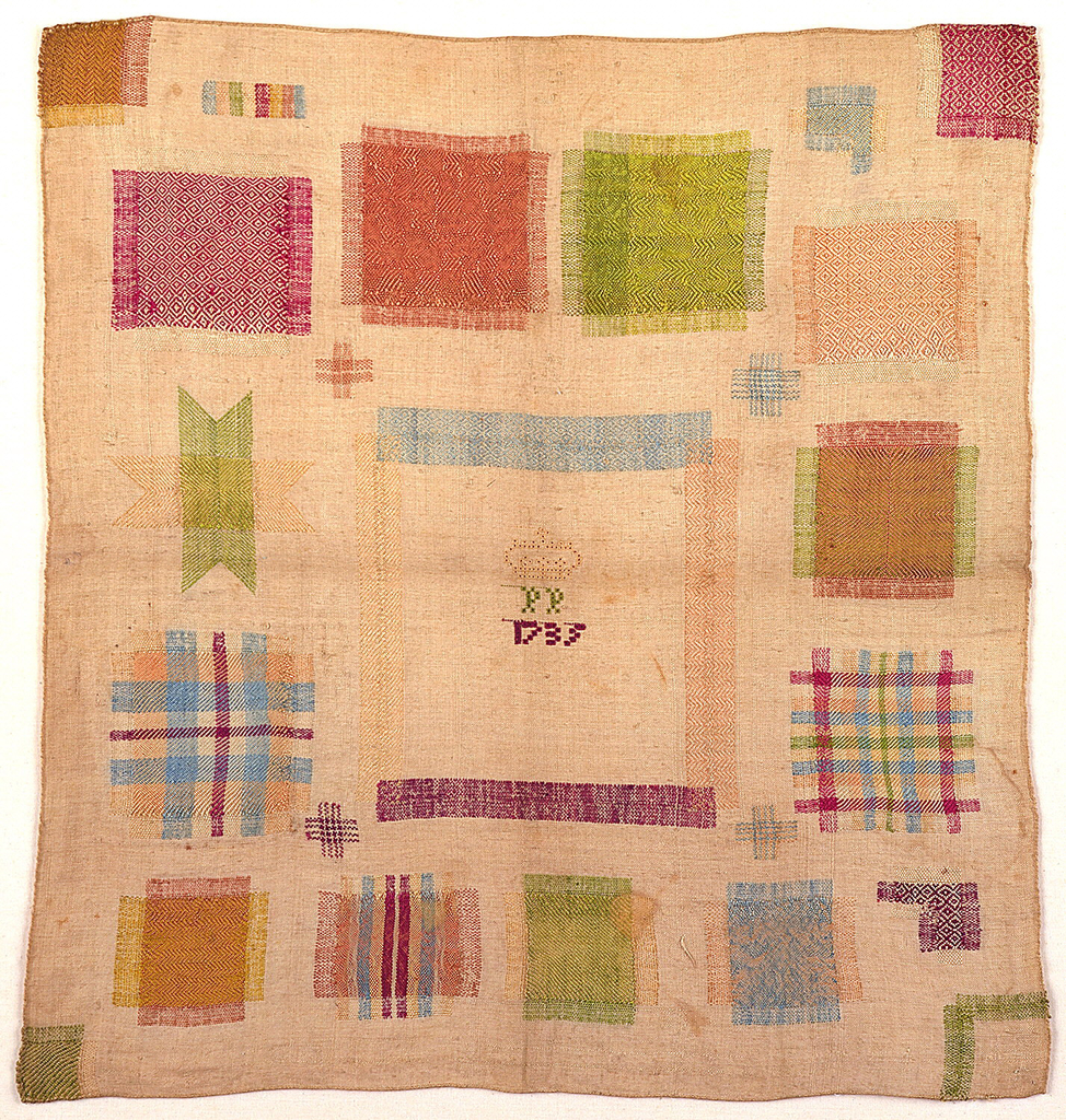 This darning sampler is also Dutch and was made in 1735 by a girl of about 12. She was confronted with a piece of fabric with 17 square-cut holes and with all four corners cut away. In the center and lower right corner she carefully darned the missing bits back into place and the rest she repaired with needle weaving (what you might call re-weaving if you were at the dry cleaners with a hole in your favorite wool pants). Each hole is filled in, thread by thread, with a different woven pattern to demonstrate the girl’s skill at repairing weave structures found in common household and clothing textiles such as herringbone, birds-eye twill, etc. Bright colors were originally selected to make it easier for the instructor to check for accuracy, but also contribute to a wonderfully fresh and modern overall effect.