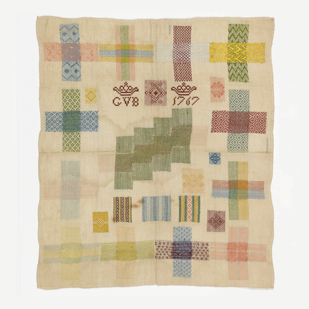 This is a Darning sampler. It is dated 1767 and we acquired it in 1981. Its medium is silk embroidery on linen foundation and its technique is embroidered in running (pattern darning) and eyelet stitches on plain weave foundation. It is a part of the Textiles department.
