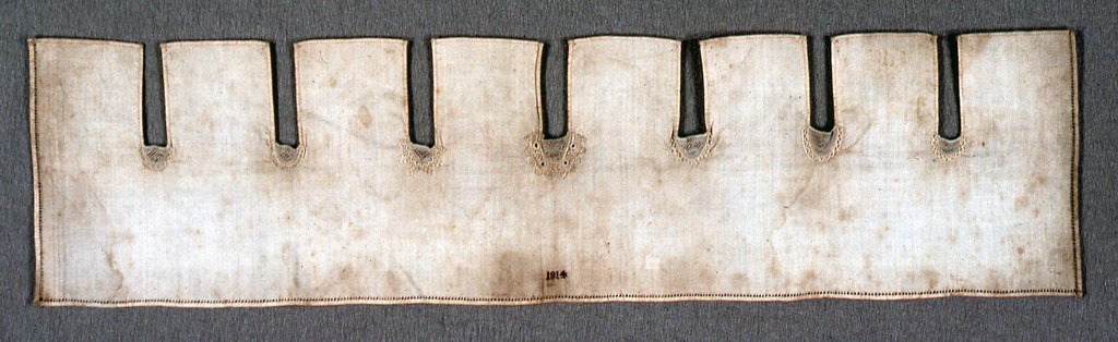 This is a Sampler. It is dated 1814 and we acquired it in 1981. Its medium is cotton and its technique is embroidered in cross, chain, buttonhole, and knot stitches with needle lace on plain weave foundation. It is a part of the Textiles department.