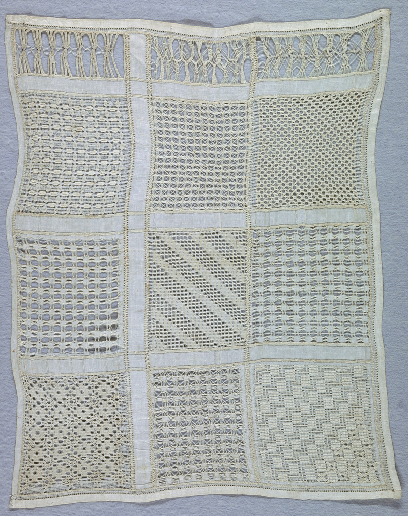 This is a Sampler. It is dated 19th century and we acquired it in 1981. Its medium is cotton and its technique is embroidered in withdrawn element work on plain weave foundation. It is a part of the Textiles department.