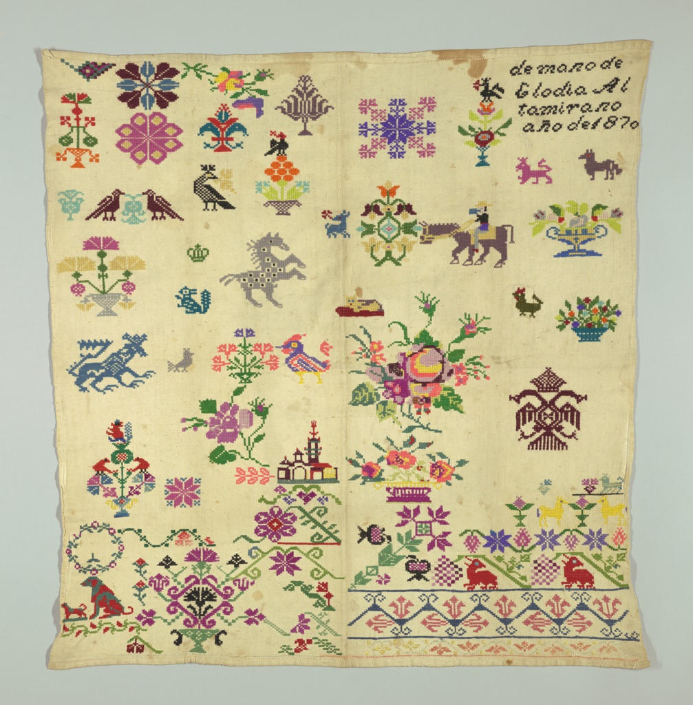 This is a Sampler. It was embroidered by Clodia Altamirano. It is dated 1870 and we acquired it in 1981. Its medium is wool embroidery on cotton foundation and its technique is embroidered in long-armed cross, cross, and double running stitches on plain weave foundation. It is a part of the Textiles department.