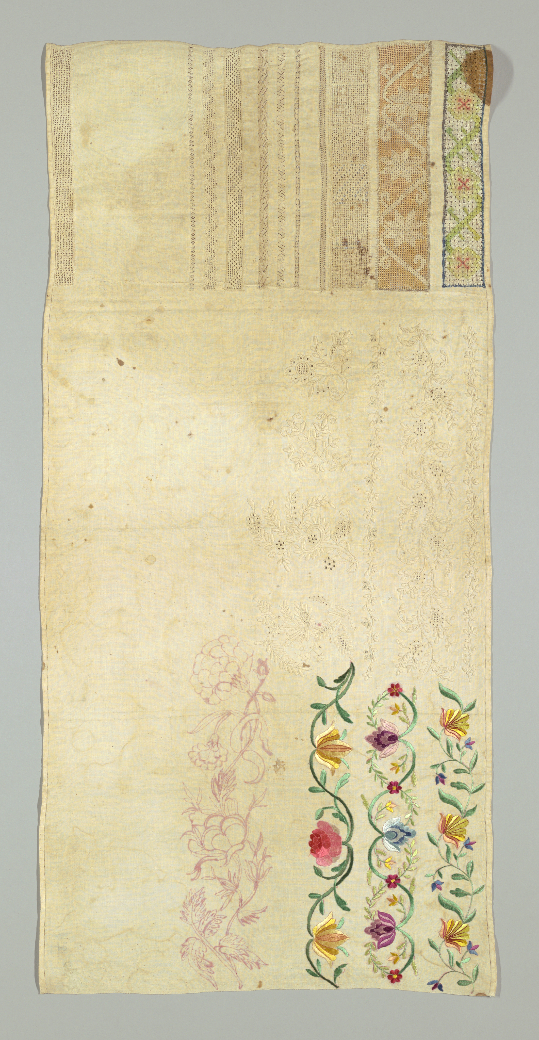 This is a Sampler. It is dated 19th century and we acquired it in 1981. Its medium is silk embroidery on cotton foundation and its technique is embroidered in withdrawn element work and satin, stem, couching, and overcasting insertions of bobbin-made net, on plain weave foundation. It is a part of the Textiles department.