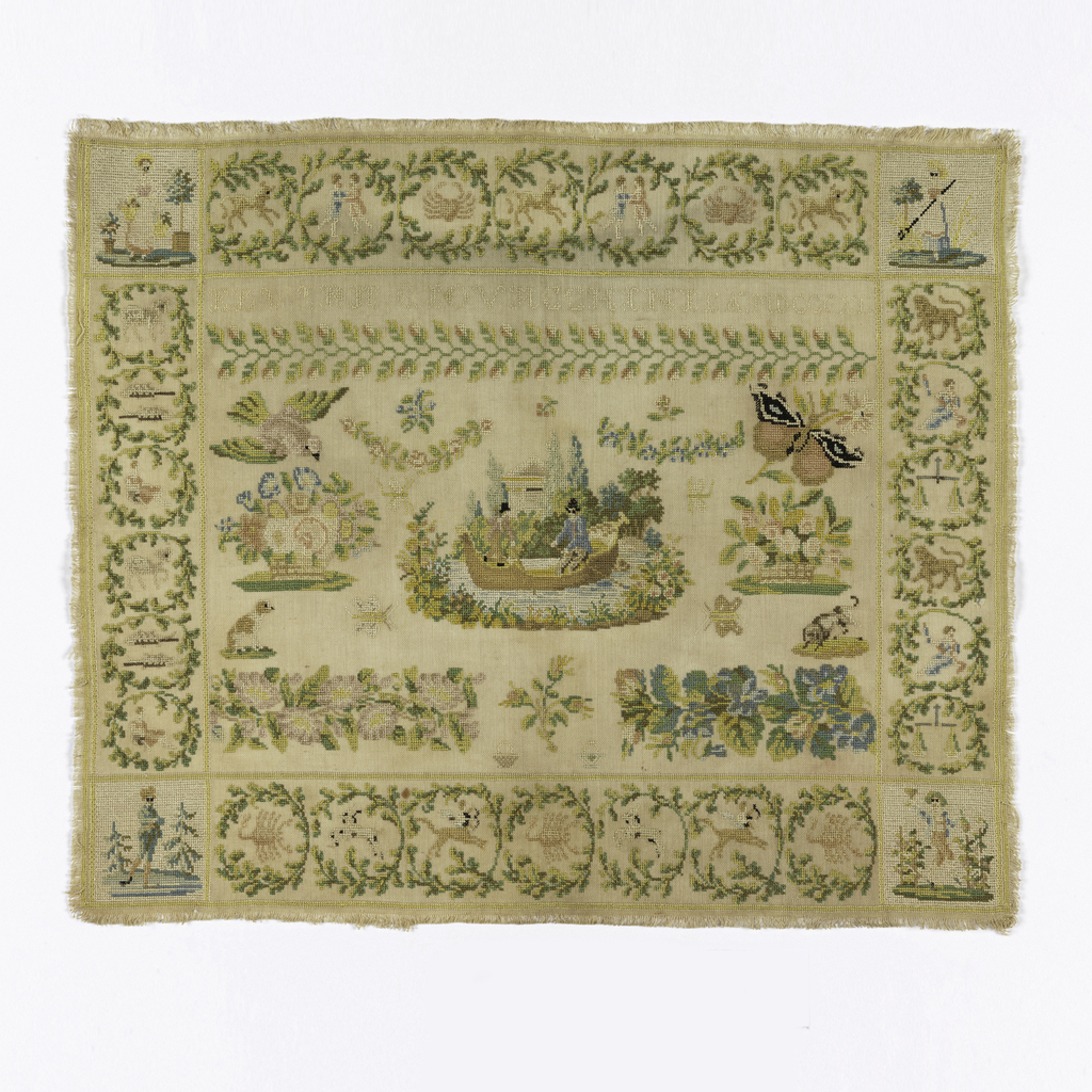 This is a Sampler. It was embroidered by Elvira Giovacchini. It is dated 1840 and we acquired it in 1981. Its medium is silk embroidery on cotton foundation and its technique is embroidered in cross and double running stitches on a plain weave foundation. It is a part of the Textiles department.