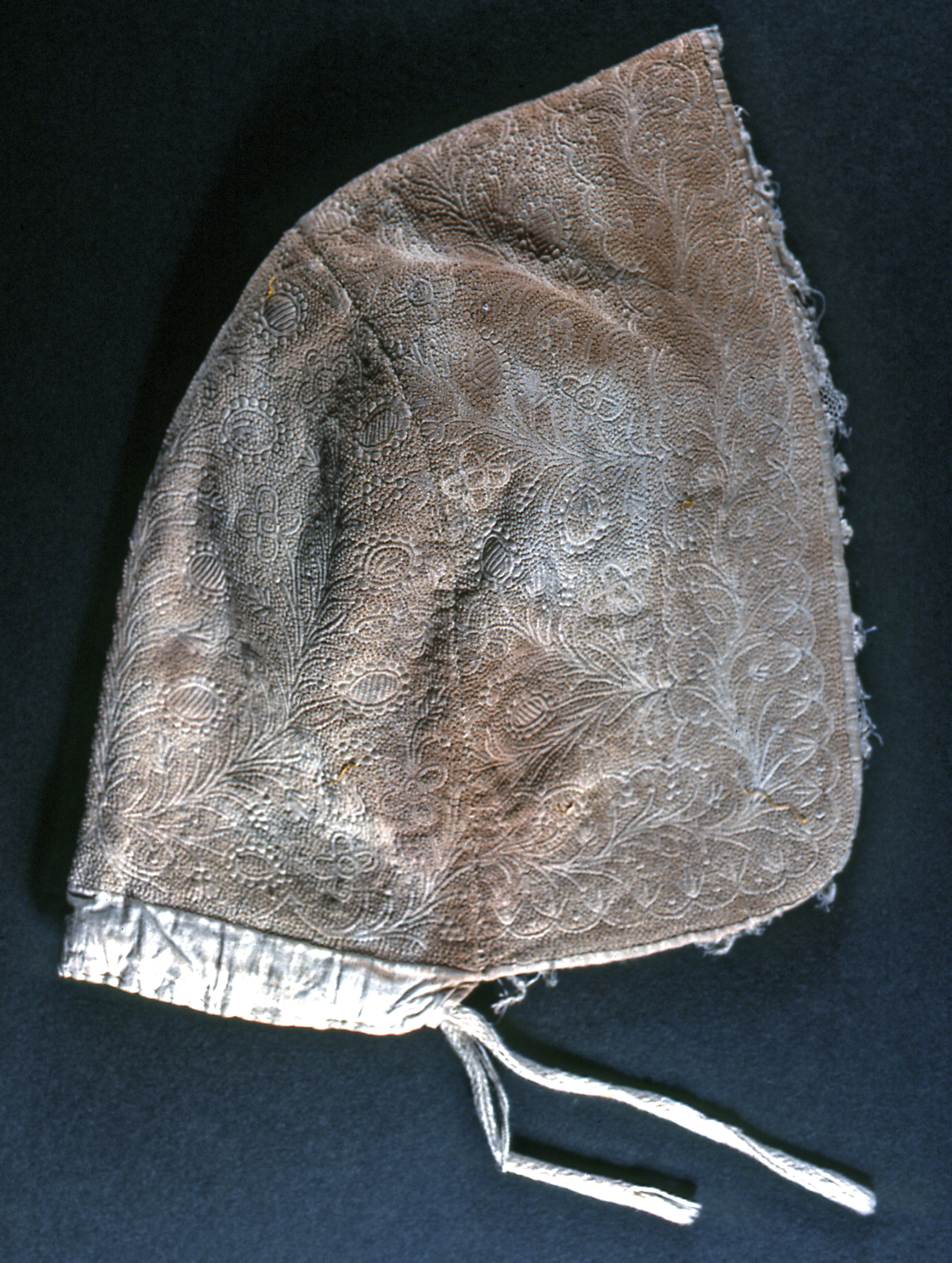 This is a Cap. It is dated 18th century and we acquired it in 1981. Its medium is cotton embroidery on cotton foundation and its technique is embroidered in knots, back stitch and underside quilting on plain weave foundation. It is a part of the Textiles department.