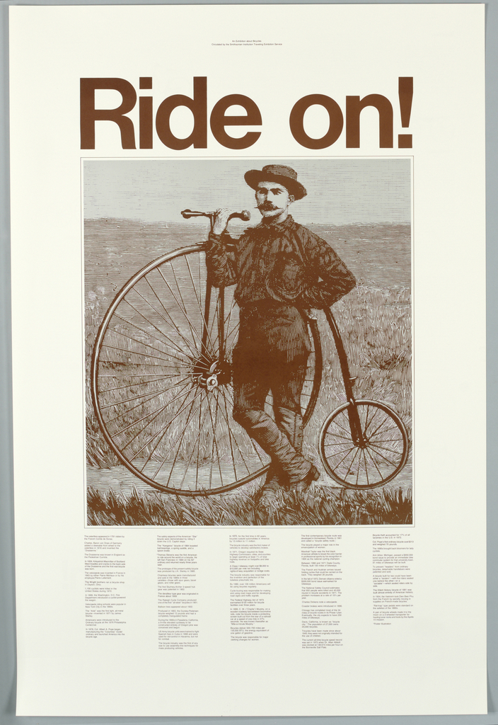 Printed in brown ink, upper center: An Exhibition about Bicycles / Circulated by the Smithsonian Institution Traveling Exhibition Service; facts about bicycles printed in five columns at lower center of composition