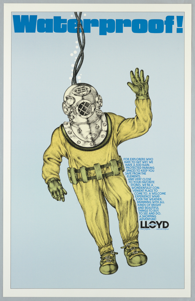 Poster, Waterproof! / Lloyd Center; Designed by Joseph Erceg (American, 1933 - 2018); USA; lithograph on paper; 58 x 37 cm (22 13/16 x 14 9/16 in.); Gift of Various Donors; 1981-29-351