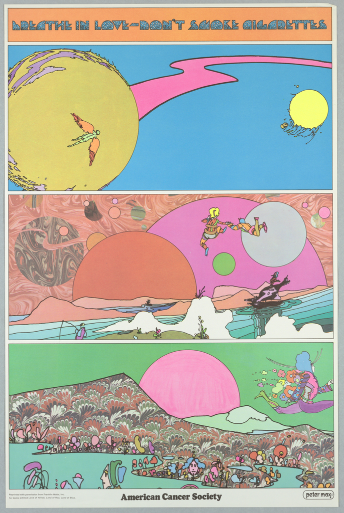Poster, Breathe in Love – Don't Smoke Cigarettes; Designed by Peter Max (American, b. Germany, 1937); USA; lithograph on wove paper; Overall: 62.8 x 41.5 cm (24 3/4 x 16 5/16 in.); Gift of Various Donors; 1981-29-370