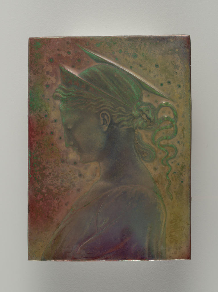 Portrait Plaque; Designed by Jacques Sicard (French, 1865–1923); Manufactured by Weller Pottery; USA; molded, glazed, and lustered earthenware; H x W x D: 22.85 x 16.8 x .5 cm ( 9 1/8 x 6 3/4 x 1/4 in.) ; Gift of Marcia and William Goodman; 1984-84-28