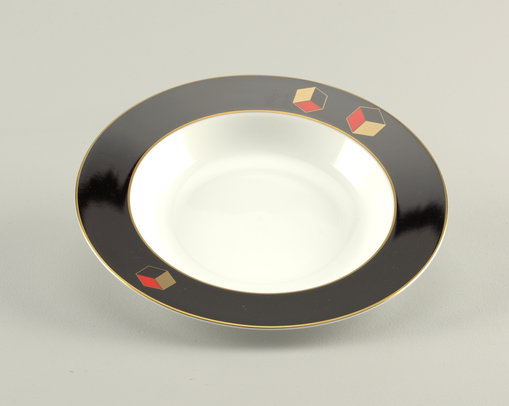 This is a Soup Bowl. It was manufactured by Arita Porcelain Company and distributed by Bloomingdale's. We acquired it in 1986. Its medium is gilt, enameled porcelain. It is a part of the Product Design and Decorative Arts department.
