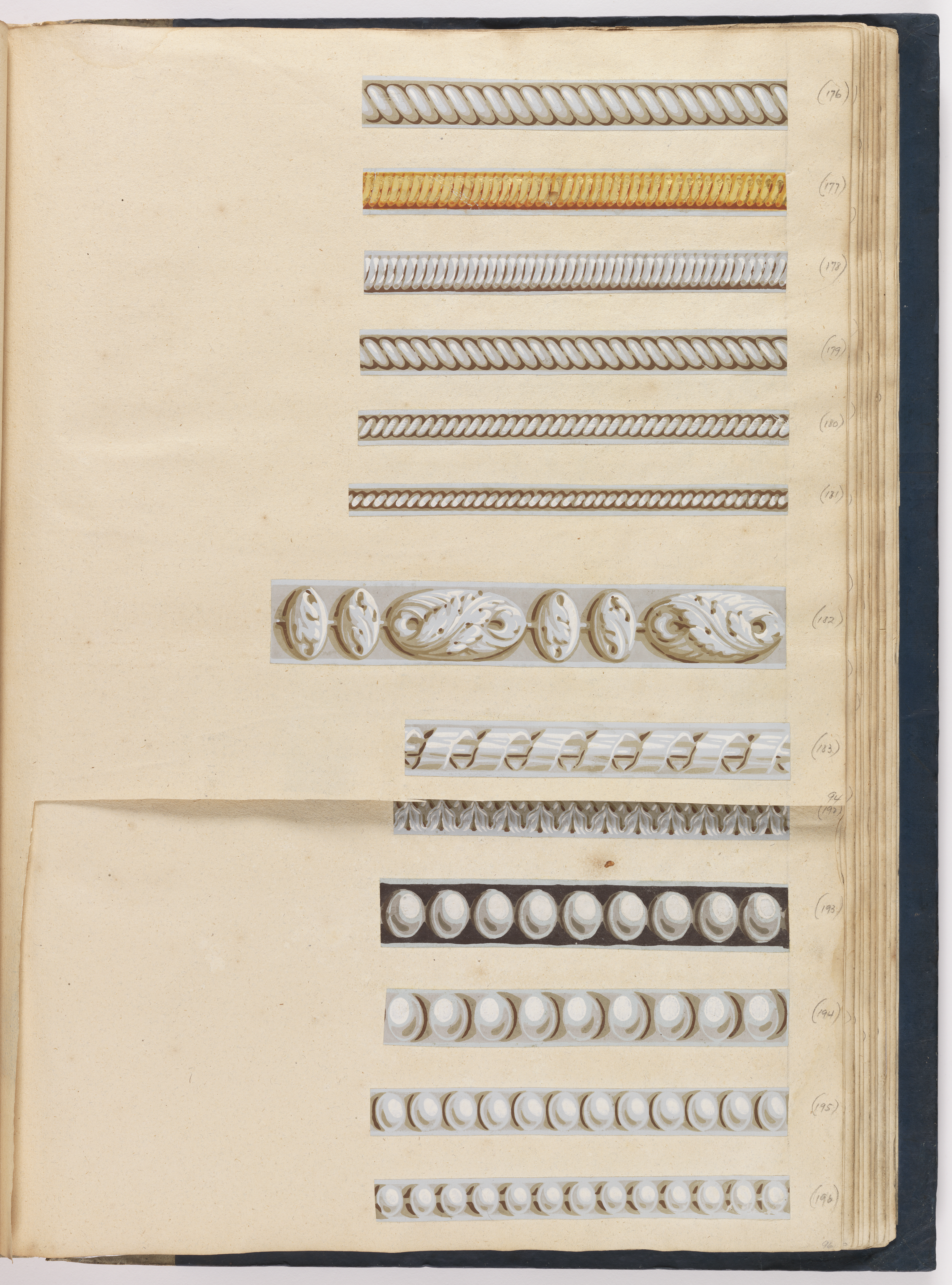 Sample Book (France); Designed by Jean-Baptiste Réveillon (French, 1725–1811); block-printed, gilded, handmade paper; H x W x D: 59 x 42 x 6 cm (23 1/4 x 16 9/16 x 2 3/8in.); Museum purchase from General Acquisitions Endowment and Decorative Arts Association Acquisitions Funds and through gift of Anonymous Donor and Bequest of Mary Hayward Weir; 1986-34-1-1/314