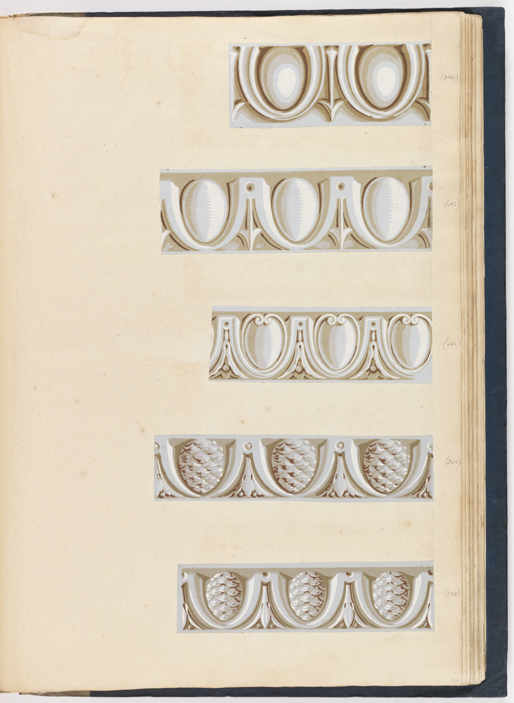 Sample Book (France); Designed by Jean-Baptiste Réveillon (French, 1725–1811); block-printed, gilded, handmade paper; H x W x D: 59 x 42 x 6 cm (23 1/4 x 16 9/16 x 2 3/8in.); Museum purchase from General Acquisitions Endowment and Decorative Arts Association Acquisitions Funds and through gift of Anonymous Donor and Bequest of Mary Hayward Weir; 1986-34-1-1/314