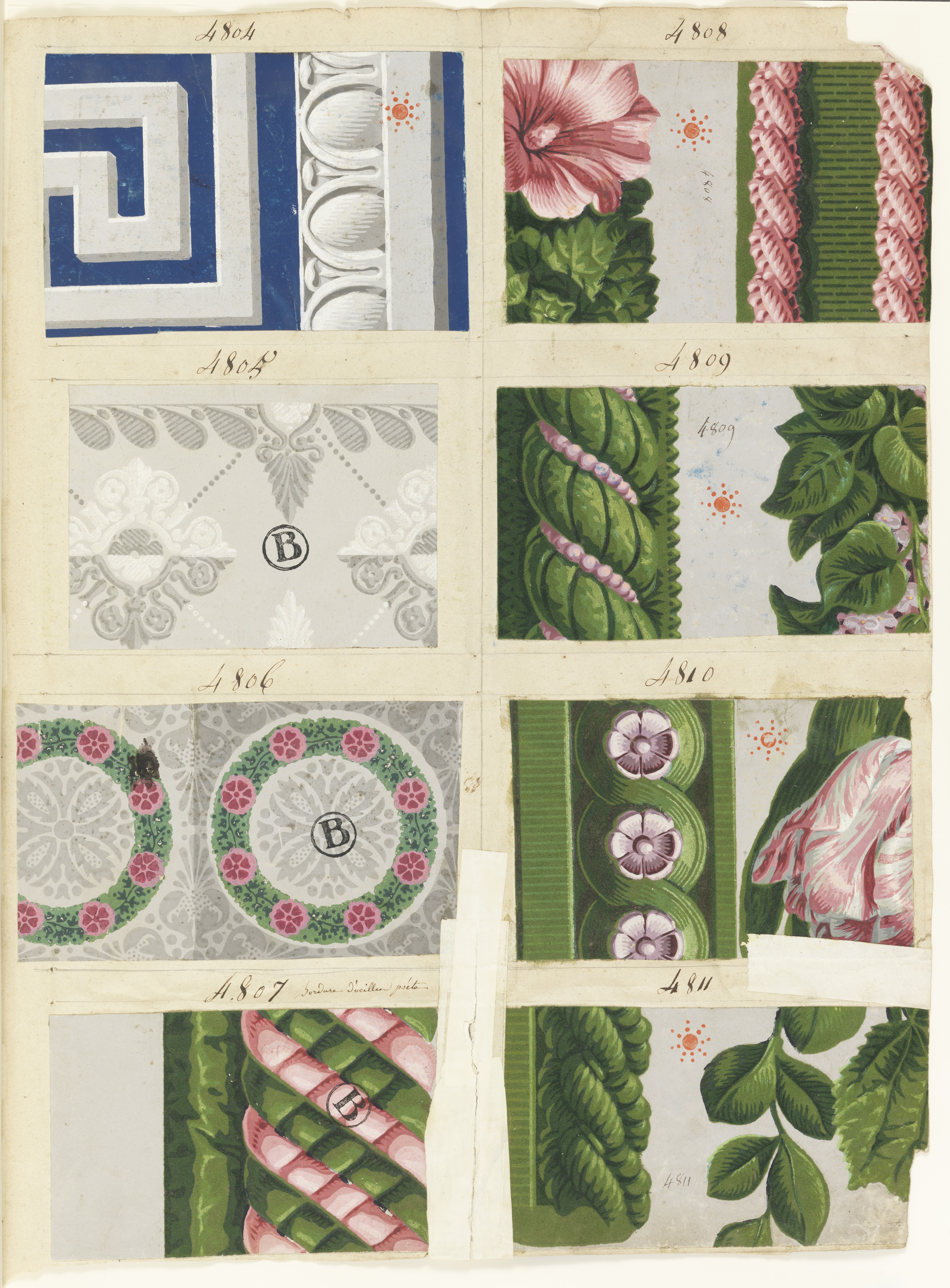 This is a Sample book. It was manufactured by Jacquemart & Bénard. It is dated 1822–30 and we acquired it in 1986. Its medium is block-printed, gilded, flocked, handmade paper. It is a part of the Wallcoverings department.