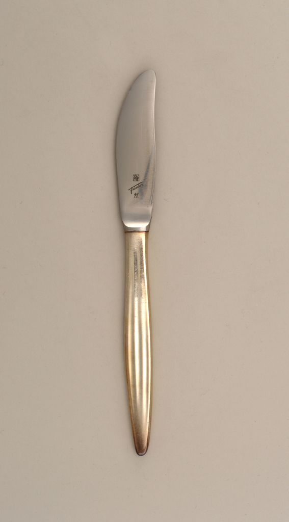 This is a knife. It was designed by Wilhelm Wagenfeld and made by Württembergische Metallwarenfabrik (WMF). It is dated ca. 1955 and we acquired it in 1986. Its medium is silver, stainless steel. It is a part of the Product Design and Decorative Arts department.