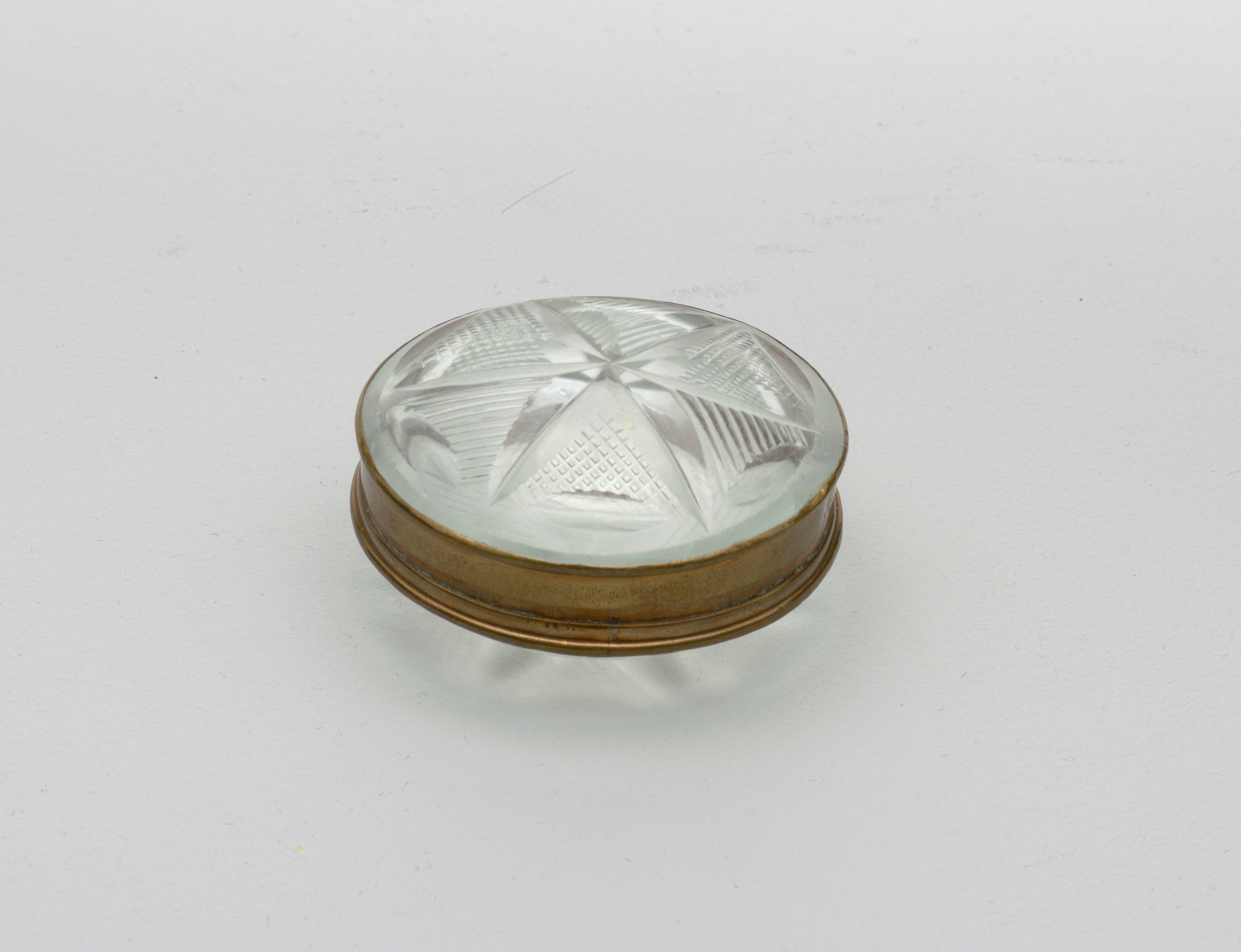 This is a box and cover. It is dated ca. 1800 and we acquired it in 1986. Its medium is glass. It is a part of the Product Design and Decorative Arts department.