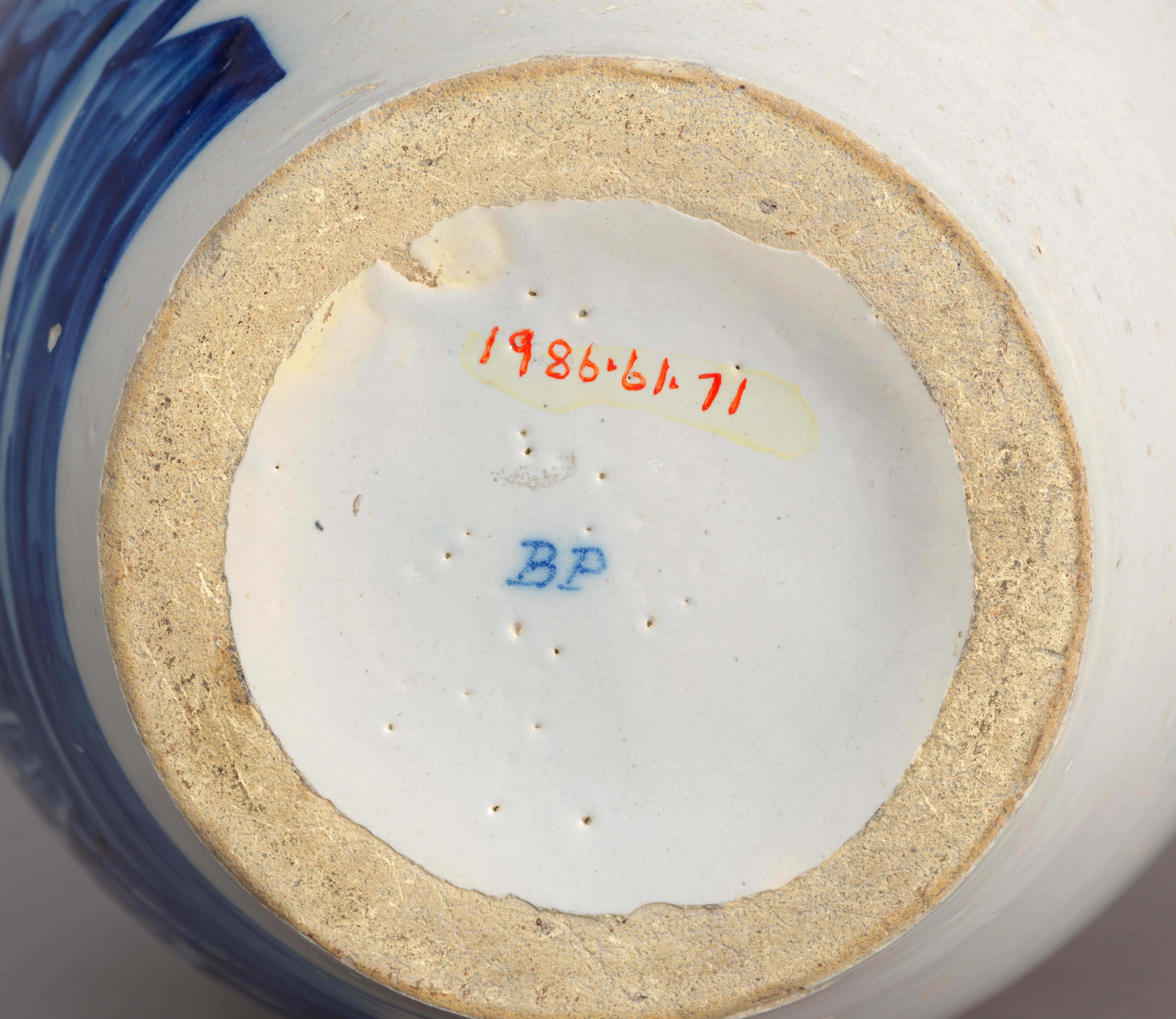 This is a Jar. It was manufactured by Vergulde Bloempot [de] (the Golden Flowerpot). It is dated ca. 1735–65 and we acquired it in 1986. Its medium is tin-glazed earthenware. It is a part of the Product Design and Decorative Arts department.