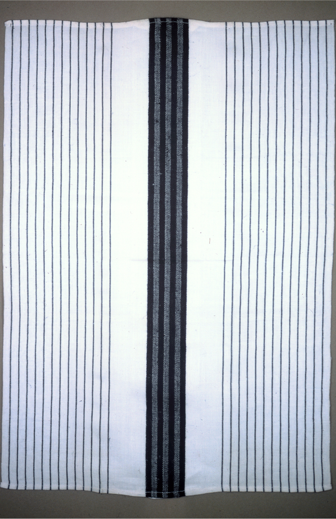 This is a Towels. It was designed by Astrid Sampe. It is dated 1955 and we acquired it in 1986. Its medium is linen and its technique is plain weave with central stripe of 3/1 and 1\3 twill woven, damask. It is a part of the Textiles department.