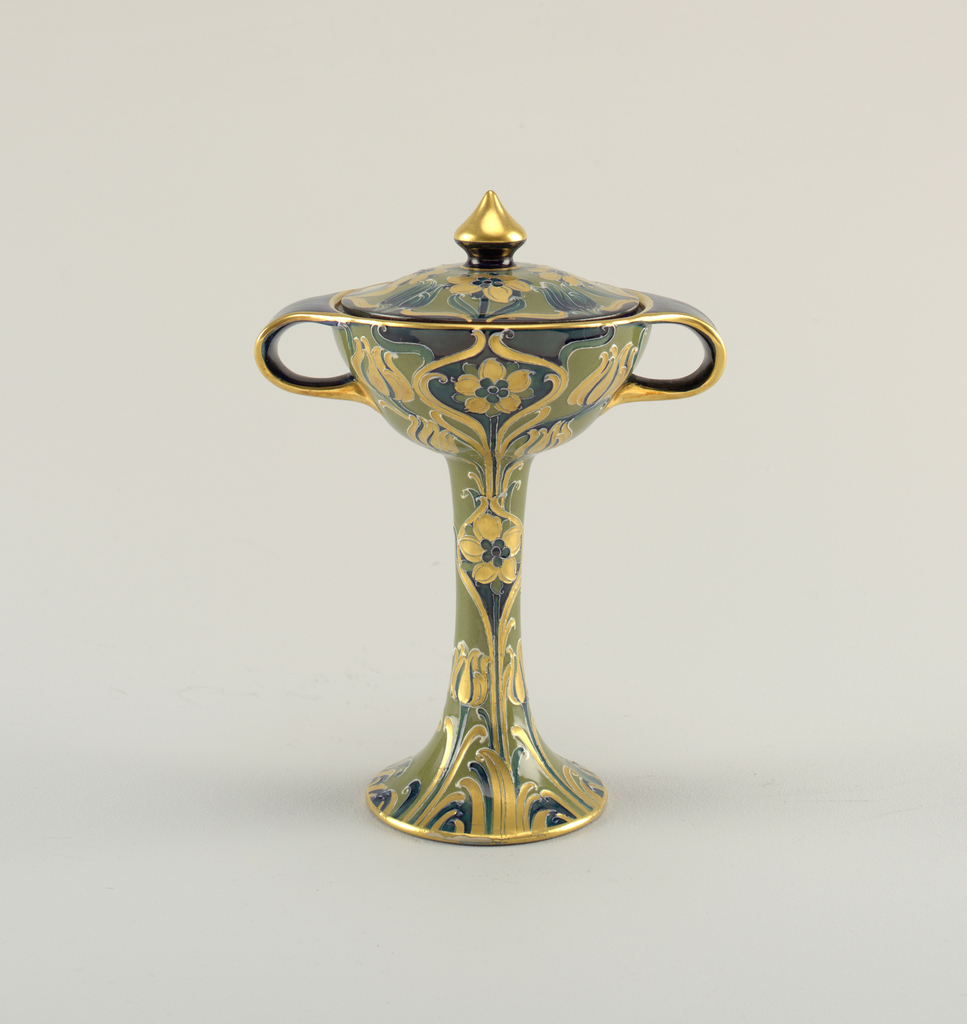 Bonbonnière And Lid (England); Manufactured by Moorcroft; gilt and glazed earthenware; H x W: 22.5 x 16 cm (8 7/8 x 6 5/16 in.); Gift of Barbara E. Busch; 1986-88-1-a,b
