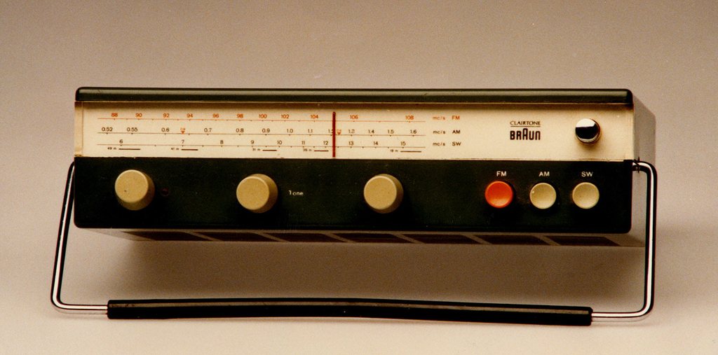 In the years before radios were standard fixtures in automobile dashboards, Clairtone marketed Braun’s T 52 to North American consumers who were getting behind the wheel in unprecedented numbers to traverse newly constructed highway systems. The versatile device served double duty as both tabletop and car radio: it could be propped up by its carrying handle when stationary or locked into an optional car mount on-the-go.