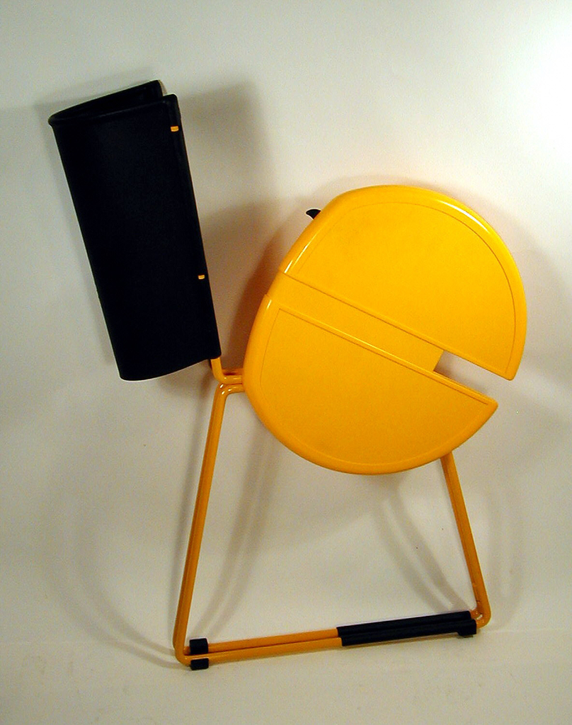 This is a chair. It was designed by G. Cairoli and manufactured by Seccose. It is dated 1985–86 and we acquired it in 1987. Its medium is steel, enamel, rubber, plastic. It is a part of the Product Design and Decorative Arts department.