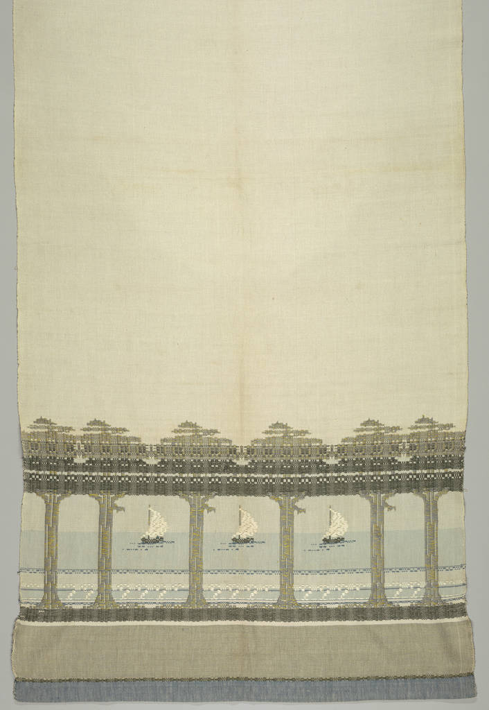This is a Curtains. It is dated 1920s and we acquired it in 1987. Its medium is mercerized cotton and its technique is plain weave with supplementary wefts (overshot). It is a part of the Textiles department.