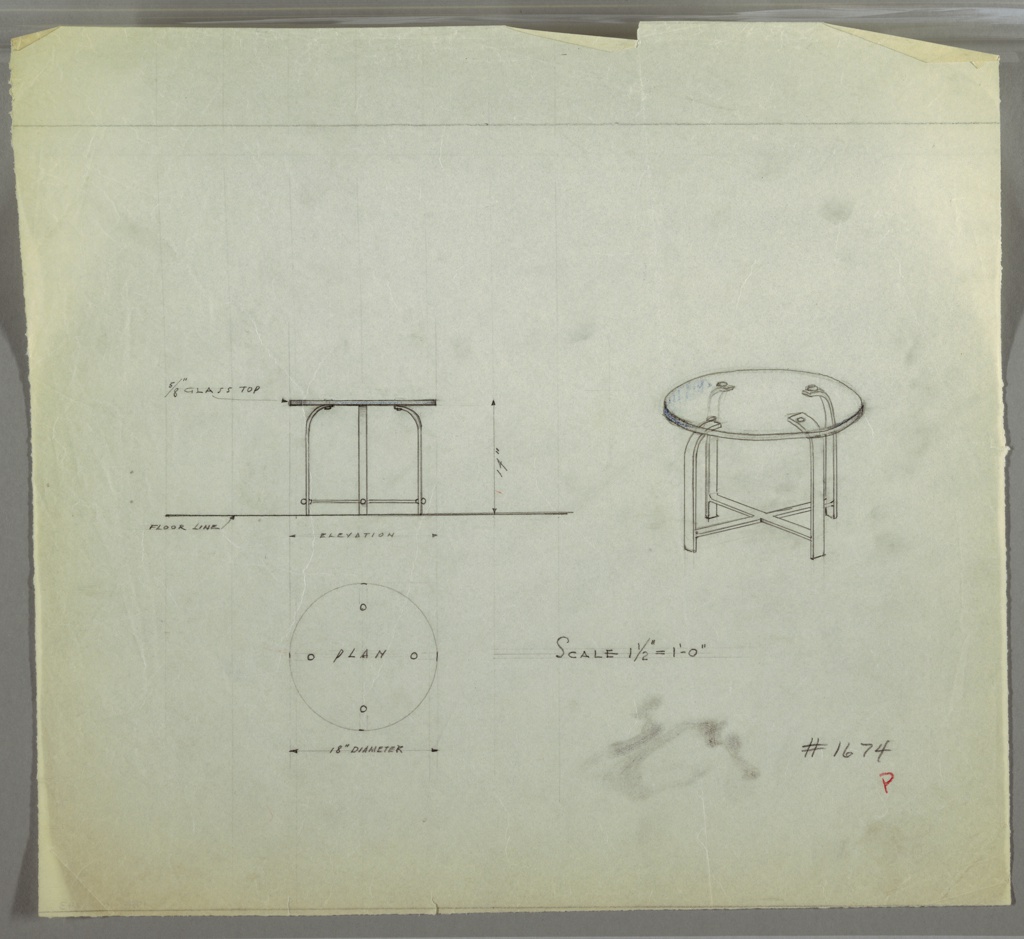 Inscribed in graphite, center right: SCALE 1 1/2"=1'0"; lower right: #1674; lower right in red color pencil: P; dimensions and materials in graphite