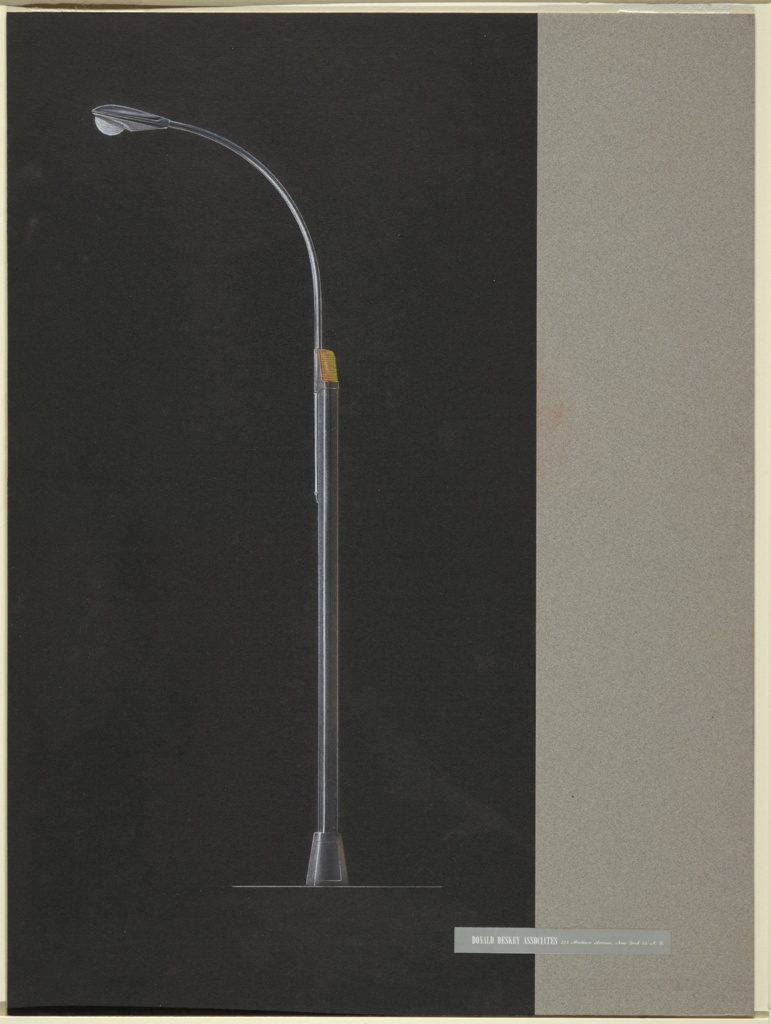Drawing, Design for New York City Streetlight; Engineered by Alexander Lurkis (American, 1908 - 2008); Office of Donald Deskey Associates; Client: N.Y.C. Dept of Water Supply, Gas and Electricity; USA; white chalk, pastel crayon, graphite, gray paper on black illustration board; 64.7 x 48.2 cm (25 1/2 x 19 in.) ; Gift of Donald Deskey; 1988-101-1664