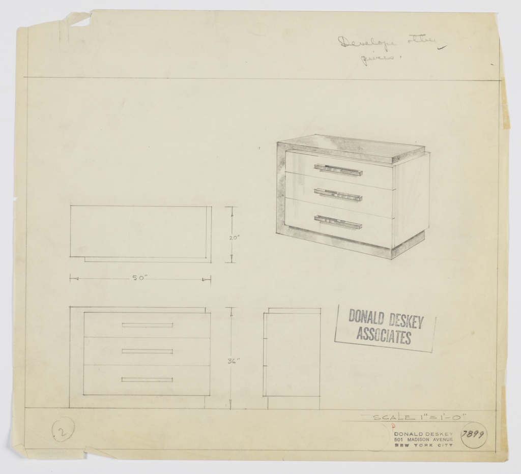 Drawing, Design for Chest of Drawers; Office of Donald Deskey (American, 1894–1989); USA; graphite on tracing paper; 34 × 37.5 cm (13 3/8 × 14 3/4 in.); Gift of Donald Deskey; 1988-101-1805