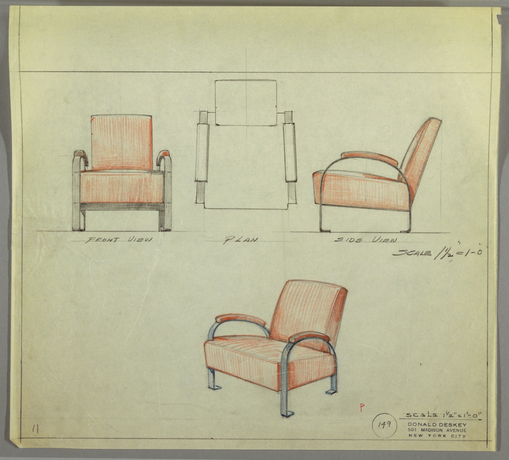 Drawing, Armchair: Metal, Upholstered; Office of Donald Deskey (American, 1894–1989); USA; graphite, orange and blue color pencil on tracing paper; 33.8 x 37 cm (13 5/16 x 14 9/16 in.); Gift of Donald Deskey; 1988-101-210