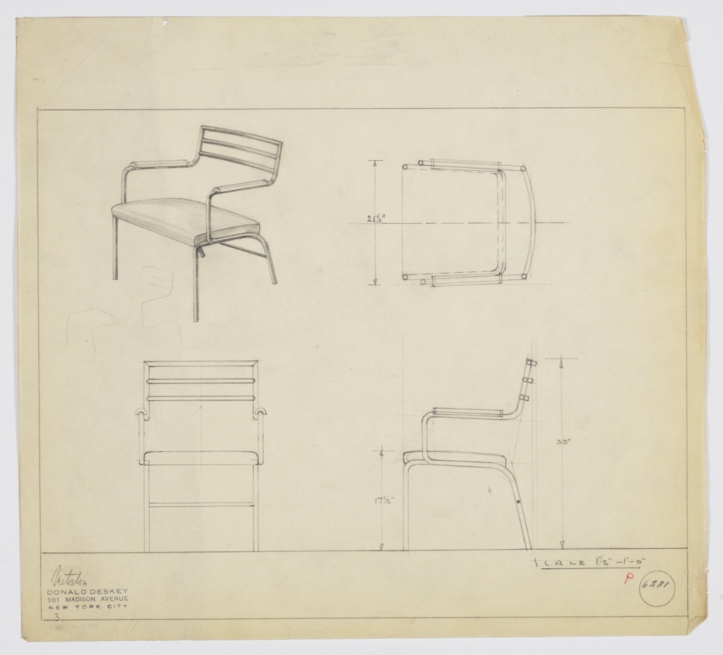 Drawing, Chair, Dining; Manufactured by Metallon; Office of Donald Deskey (American, 1894–1989); USA; graphite on tracing paper; 34.3 x 37.7 cm (13 1/2 x 14 13/16 in.); Gift of Donald Deskey; 1988-101-237