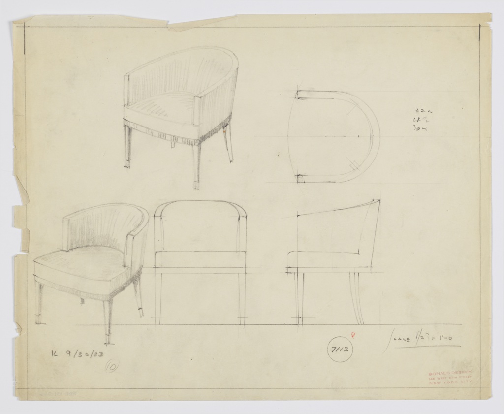 This is a Drawing. It was from the office of Donald Deskey and drafted by K. and manufactured by Kroehler Manufacturing Co.. It is dated September 30, 1933 and we acquired it in 1988. Its medium is graphite on tracing paper. It is a part of the Drawings, Prints, and Graphic Design department.
