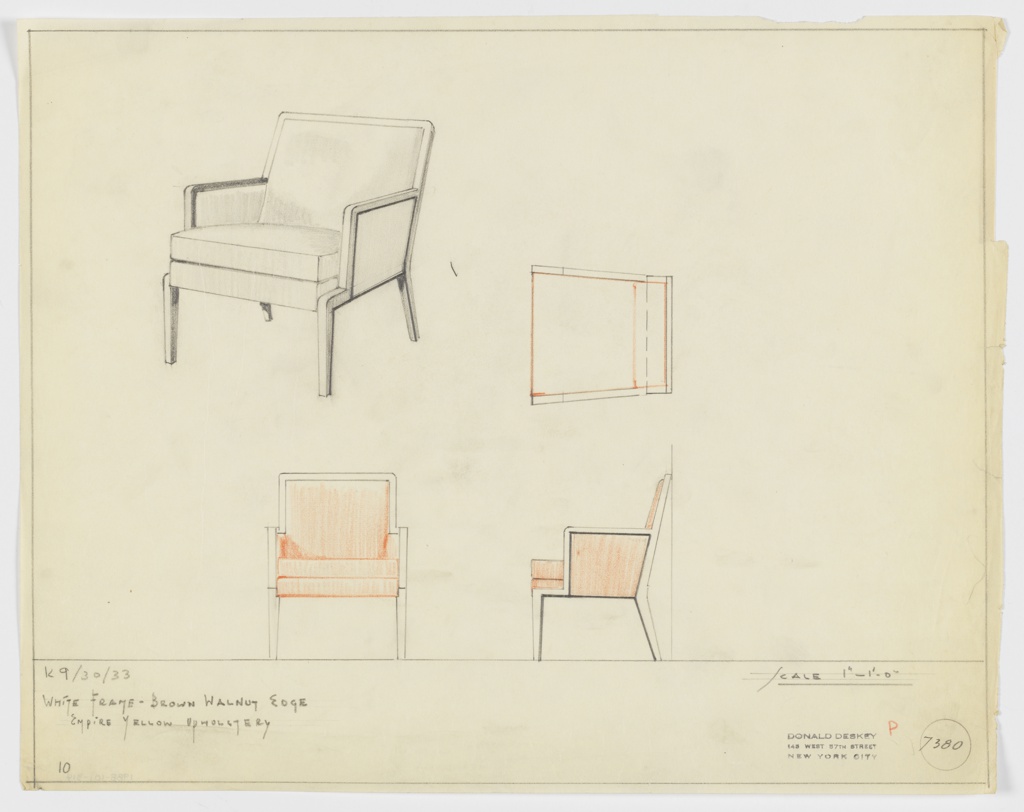 Inscribed in graphite at lower left: K 9/30/33 / WHITE FRAME - BROWN WALNUTEDGE / EMPIRE YELLOW UPHOLSTERY Inscribed in graphite at lower left: 10 Inscribed in red color pencil at lower right: P