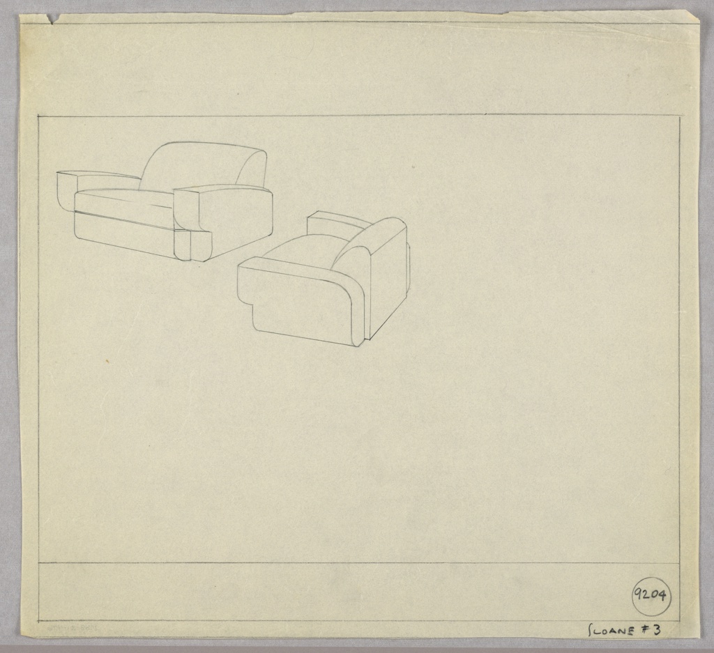 Drawing, Armchair; Manufactured by W. and J. Sloane (United States); Office of Donald Deskey Associates, Donald Deskey (American, 1894–1989); USA; graphite on tracing paper; 34.4 x 37.4 cm (13 9/16 x 14 3/4 in.); Gift of Donald Deskey; 1988-101-476