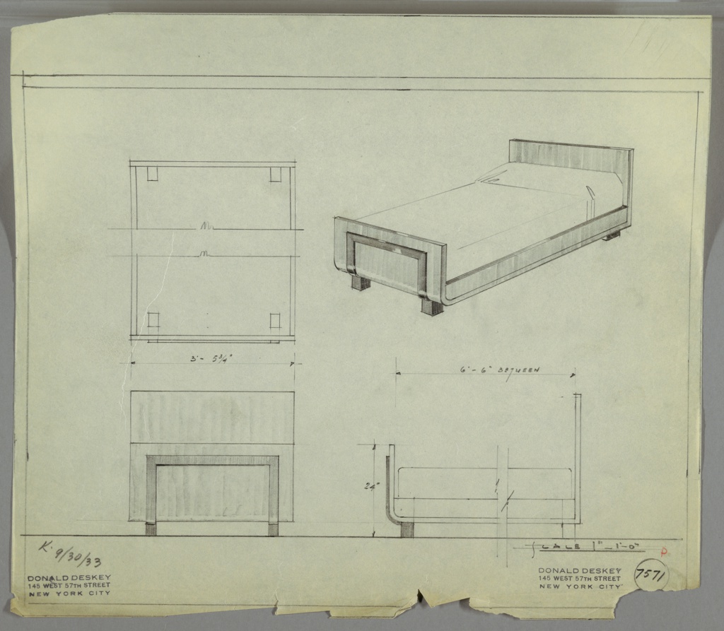 Drawing, Design for Bed; Office of Donald Deskey (American, 1894–1989); Manufactured by Kroehler Manufacturing Co.; Drafted by K.; USA; graphite on tracing paper; 32.2 x 37 cm (12 11/16 x 14 9/16 in.) Loss,torn:lower edge; Gift of Donald Deskey; 1988-101-54