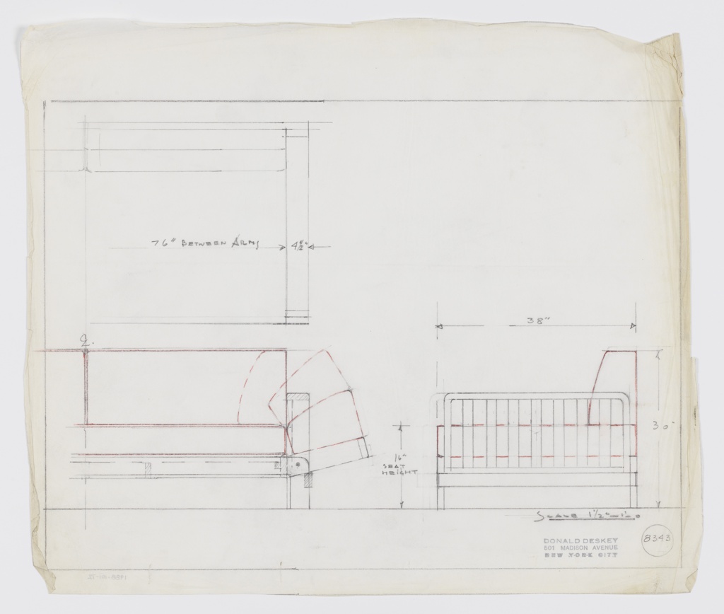 Drawing, Design for Sofabed; Office of Donald Deskey (American, 1894–1989); USA; graphite, red color pencil on tracing paper; 33.9 x 41 cm (13 3/8 x 16 1/8 in.) Creased, side edges; Gift of Donald Deskey; 1988-101-72