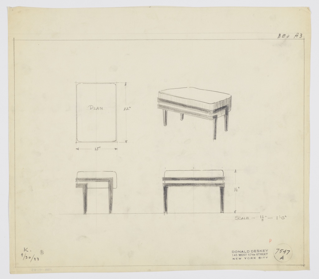 This is a Drawing. It was from the office of Donald Deskey and drafted by K. and manufactured by Kroehler Manufacturing Co.. It is dated September 30, 1933 and we acquired it in 1988. Its medium is graphite on tracing paper. It is a part of the Drawings, Prints, and Graphic Design department.