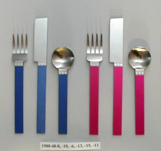 Known for his jewelry and metalwork in anodized aluminum, designer Tisdale chose blue as one of the colors for his Electra flatware series of 1986 because it is a signature anodized color, and it was approved by the U.S. Food and Drug Administration at that time.