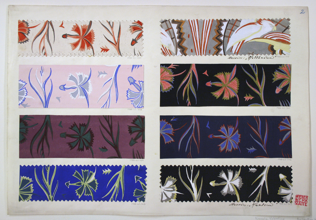 This is a Drawing. It was designed by Valentine Kovaćić and made for Wiener Werkstätte. It is dated 1916–1918 and we acquired it in 1988. Its medium is brush and gouache on paper. It is a part of the Drawings, Prints, and Graphic Design department.