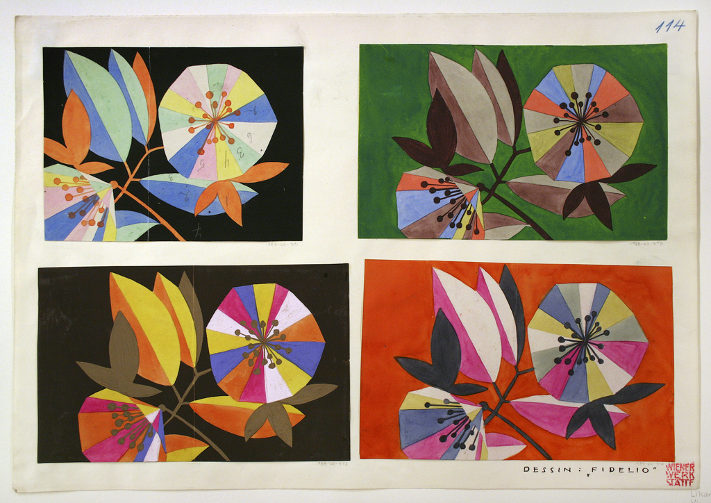 Maria Likarz-Strauss was one of the most prolific designers for the Wiener Werkstätte, creating her first design for them in 1912. Her designs frequently featured geometric patterns of stylized floral motifs rendered in vivid, saturated colors.