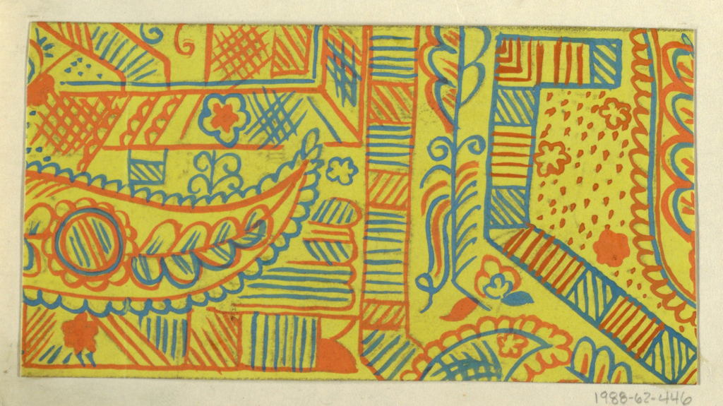 Drawing, Textile Design: Gallus; Made for Wiener Werkstätte (Austria); Austria; brush and gouache on paper; 7.6 x 13.5 cm (3 in. x 5 5/16 in.), irregular Mat: 32.5 x 46.2 cm (12 13/16 x 18 3/16 in.); Museum purchase from Smithsonian Collections Acquisition and Decorative Arts Association Acquisition Funds; 1988-62-446