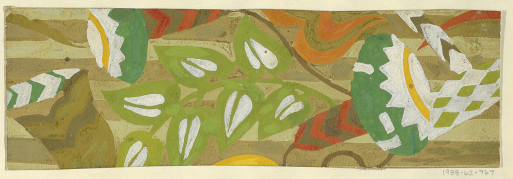Drawing, Textile Design: Harlekin (Harlequin); Designed by Dagobert Peche (Austrian, 1887–1923, active Vienna, 1911–1923); Made for Wiener Werkstätte (Austria); Austria; brush and gouache on paper; 6.7 × 20.3 cm (2 5/8 in. × 8 in.) Mat: 31.8 × 45.1 cm (12 1/2 × 17 3/4 in.); Museum purchase from Smithsonian Collections Acquisition and Decorative Arts Association Acquisition Funds; 1988-62-766