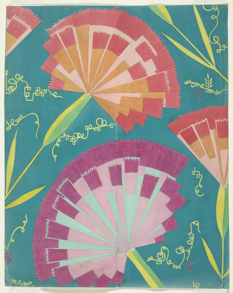 Drawing, Textile Design: Purpurnelke (Purple Pink); Designed by Felice Rix-Ueno (Austrian, 1893–1967, active Japan 1935–1967); Made for Wiener Werkstätte (Austria); brush and gouache, graphite on paper; 35.6 × 28.6 cm (14 in. × 11 1/4 in.) Mat: 55.9 × 40.6 cm (22 × 16 in.); Museum purchase from Smithsonian Collections Acquisition and Decorative Arts Association Acquisition Funds; 1988-62-895