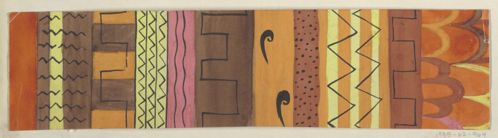 Drawing, Textile Design: Tokio (Tokyo); Designed by Felice Rix-Ueno (Austrian, 1893–1967, active Japan 1935–1967); Made for Wiener Werkstätte (Austria); brush and gouache on paper; 7.9 × 20.3 cm (3 1/8 in. × 8 in.) Mat: 31.8 × 45.7 cm (12 1/2 in. × 18 in.); Museum purchase from Smithsonian Collections Acquisition and Decorative Arts Association Acquisition Funds; 1988-62-964