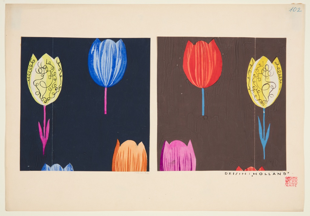 This is a Drawing. It was designed by Felice Rix-Ueno and made for Wiener Werkstätte. It is dated 1924 and we acquired it in 1988. Its medium is brush and gouache on paper. It is a part of the Drawings, Prints, and Graphic Design department.