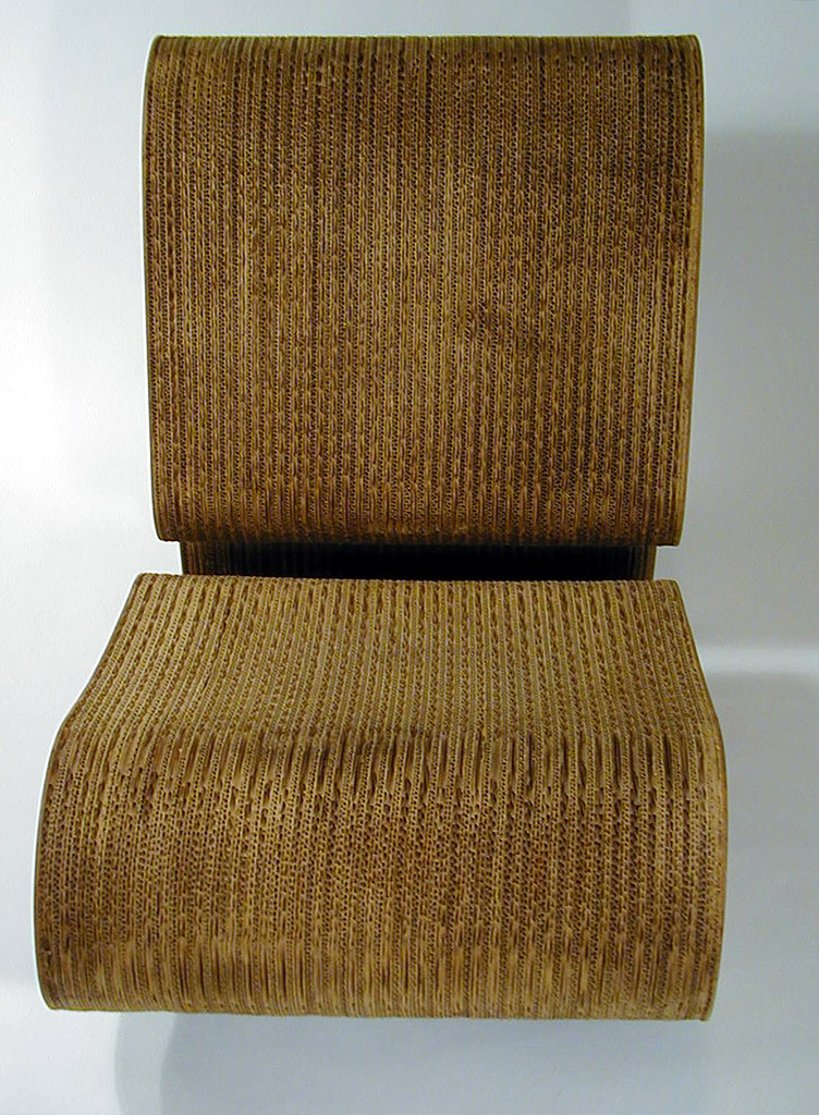 Gehry introduced his “Easy Edges” series in 1969 as a means of mass-producing furniture composed of an unusual but inexpensive material. The furniture, such as this lounge chair, was made of layered corrugated cardboard strengthened on its flat sides by Masonite, allowing the textured edges to remain visible. Although he intended the series as an inexpensive alternative to popular bentwood furniture, Gehry discontinued it in 1973 when sale prices became too high.