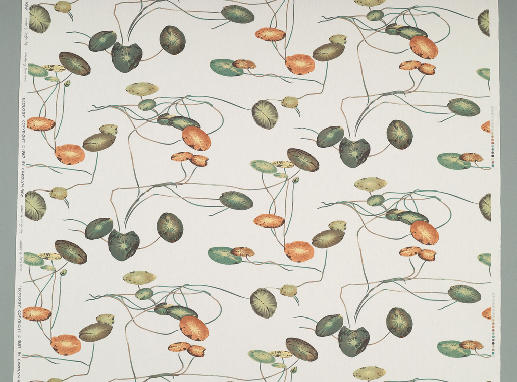 Textile, Ecology; Designed by Carolyn Ray; Company: Carolyn Ray Inc.; Made by Heberlein Textildruck AG (Switzerland); USA; cotton; Warp x Weft: 272.4 x 140.3 cm (8 ft. 11 1/4 in. x 55 1/4 in.) selvedge to selvedge Vertical offset repeat H x W: 54.6 x 66.7 cm (21 1/2 x 26 1/4 in.); Gift of Carolyn Ray Inc.; 1988-91-3