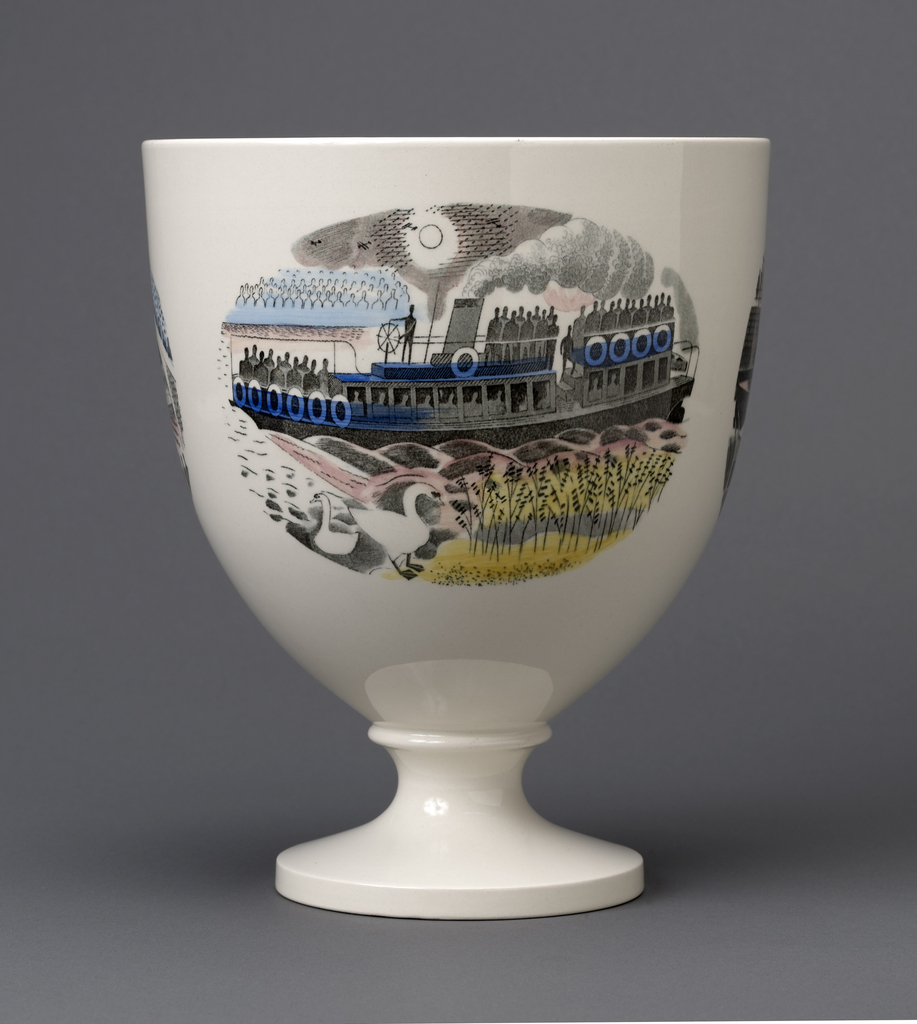 Boat Race Day Footed Bowl; Manufactured by Wedgwood (United Kingdom); England; glazed earthenware, transfer-printed and hand-colored decoration; H x diam.: 25.5 x 21.3 cm (10 1/16 x 8 3/8 in.); Gift of Paul F. Walter; 1989-110-1