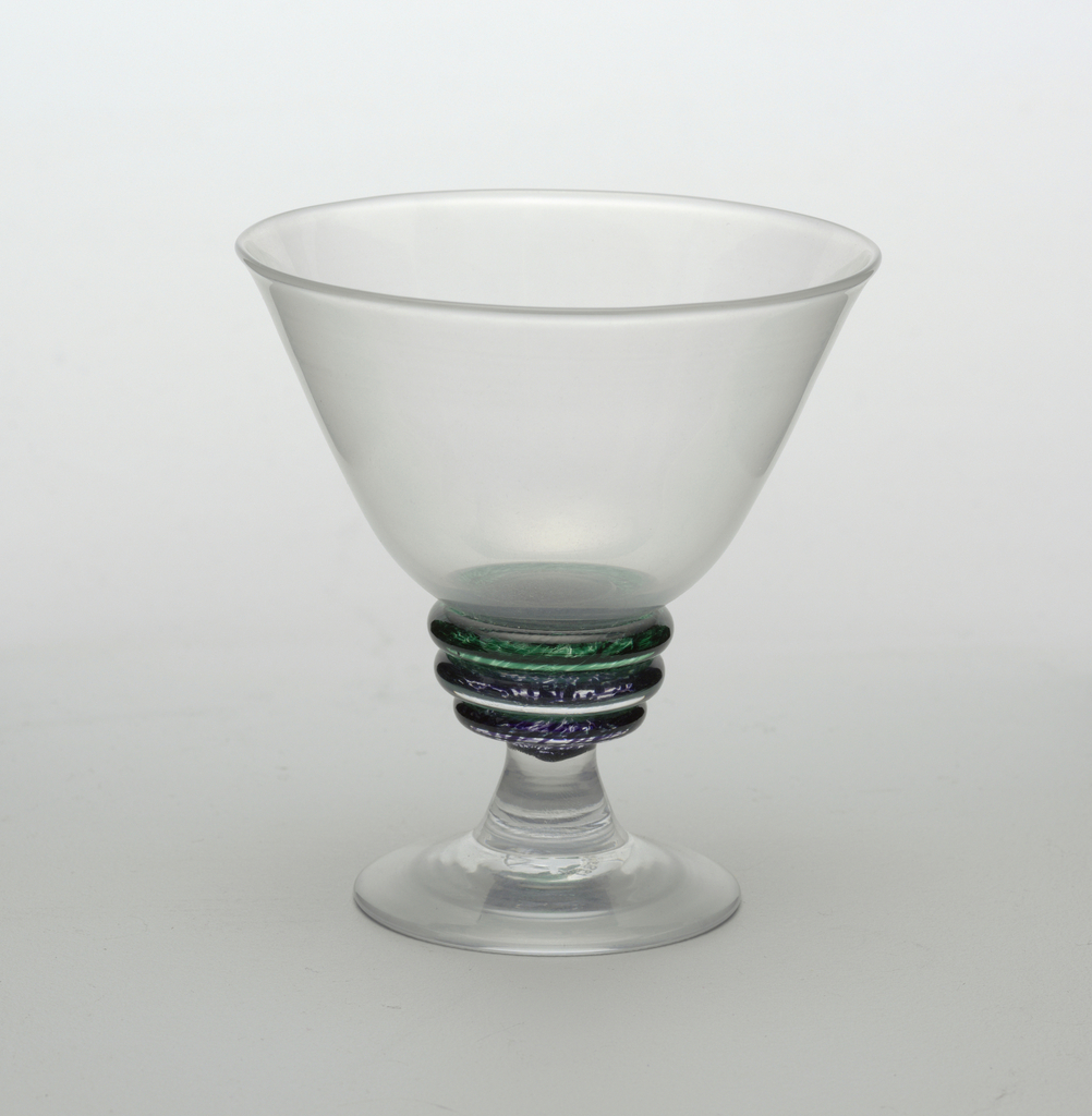 This is a Goblet. It was designed by Michel Bouchard and produced by Quartz Diffusion. It is dated 1988 and we acquired it in 1989. Its medium is glass. It is a part of the Product Design and Decorative Arts department.