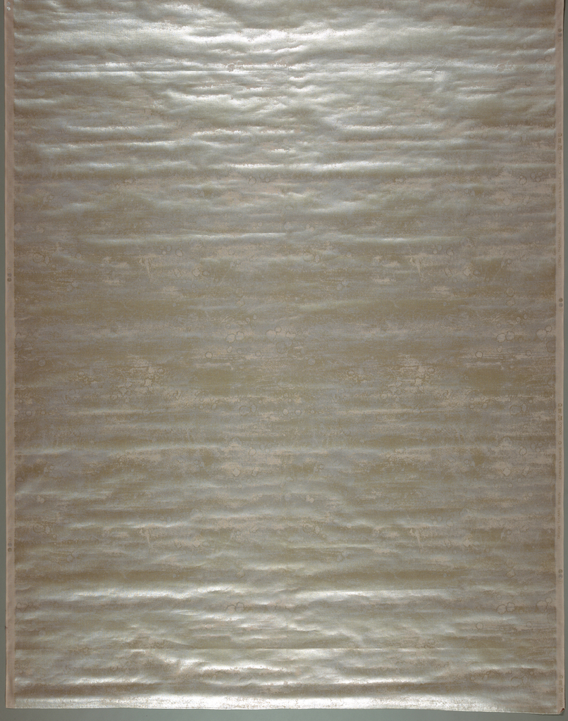 This is a Textile. It was company: Zimmer + Rohde. We acquired it in 1989. Its technique is screen printed on plain weave(three screen dots, pearlized tan, pearlized pale mauve and pearlized grey. jacquard: screen print, discharge. screen dots at left and right edges: 11 screen dots. white, 4 grey, blue, purple, 3 brown and pink. It is a part of the Textiles department.